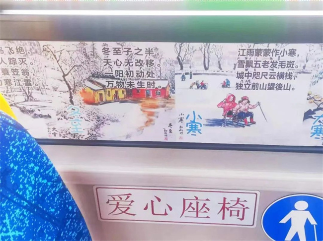 據(jù)方堃介紹,除了給乘客提供座墊套的服務(wù)外,她還通過(guò)上網(wǎng)搜集24節(jié)氣常識(shí)和詩(shī)句,在車廂內(nèi)的座位附近張貼了24節(jié)氣的相關(guān)詩(shī)句,方便乘客了解民風(fēng)民俗,弘揚(yáng)傳統(tǒng)文化,這些常識(shí)類的詩(shī)句很受一些帶孩子乘車的家長(zhǎng)和孩子們的歡迎。