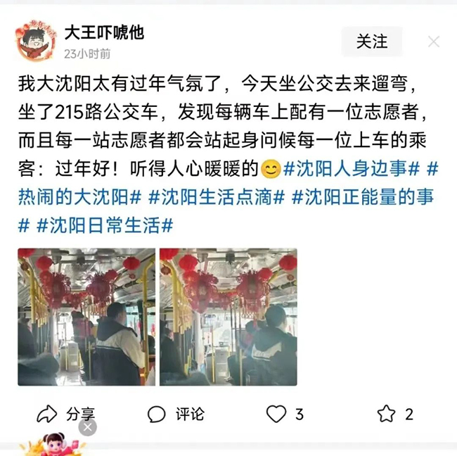 “我大沈陽太有過年氣氛了,今天坐公交車出去遛彎,坐了215路公交車,發(fā)現(xiàn)每輛車上配有一位志愿者,而且每一位志愿者都會站起身向上車的乘客說一聲‘過年好’,聽得人心暖暖的?!边@是網(wǎng)上的一則評論,作為一名公交人,看到網(wǎng)友對我們工作的肯定,也讓我們備受鼓舞。