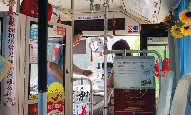 260路四星級(jí)駕駛員繆立眾早早來到工作崗位,做好出車前各項(xiàng)準(zhǔn)備工作的同時(shí),還將提前準(zhǔn)備好的五彩繩、香包、葫蘆等寓意平安、健康的小禮物擺放在駕駛室。每到一站,他都起身微笑著向上車的乘客送上祝福,并將小禮物贈(zèng)送給每一位乘客。收到祝福的乘客們充滿了驚喜和感動(dòng),紛紛豎起大拇指,對(duì)這位駕駛員的暖心舉動(dòng)贊不絕口。