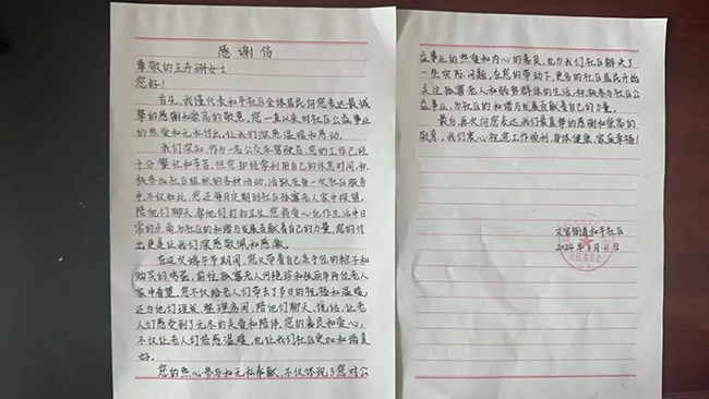 王卉珊的暖心善舉讓文官街道和平社區(qū)的書記深受感動(dòng),社區(qū)書記特地寫了一封感謝信,來到212路車隊(duì)親手交到王卉珊手中,向王卉珊表示最誠(chéng)摯的謝意和崇高的敬意。