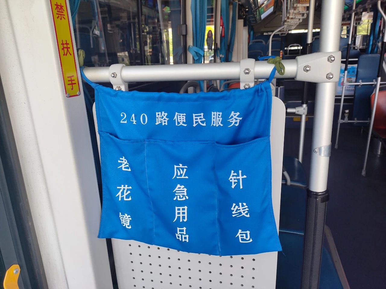 在240路的乘客中,老年乘客占比約55%,為提供更貼心、細(xì)心的服務(wù),車廂內(nèi)配備了一系列便民設(shè)施:急救藥品、口罩、老花鏡、針線以備不時(shí)之需;無障礙設(shè)施方便特殊乘客;愛心座椅專為老人、孕婦、兒童等群體設(shè)置;“愛心雨傘”保障雨天出行無憂。這些設(shè)施充分體現(xiàn)了以乘客為中心的服務(wù)理念。