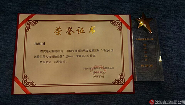 3月23日,第三屆“尋找中國運輸風(fēng)范人物領(lǐng)袖品牌”活動在北京國家交通運輸部揭曉最終評選結(jié)果,來自沈陽客運集團有限公司黃河公共汽車分公司的210路駕駛員,沈陽市勞動模范楊麗麗同志榮獲“中國運輸風(fēng)范人物愛心公益” 獎項,為沈城公交行業(yè)爭得了榮譽。
