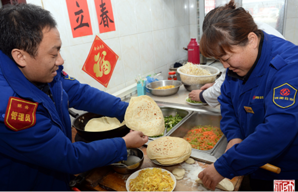 車隊(duì)齊隊(duì)長(zhǎng)告訴記者,去年冬運(yùn)開(kāi)始后,沈陽(yáng)各條公交線路終點(diǎn)站食堂為一線職工提供免費(fèi)早午餐,保證駕駛員吃飽喝足再開(kāi)工?!巴?,早餐做花卷、雞蛋、粥等早點(diǎn),午餐是兩素一葷,保證駕駛員營(yíng)養(yǎng)充足?!饼R隊(duì)長(zhǎng)說(shuō),初七當(dāng)天是節(jié)后第一個(gè)工作日,2條線路60名駕駛員全部到崗。當(dāng)天恰逢“立春”,立春是二十四節(jié)氣之首,是民間最為重視的一個(gè)節(jié)氣,這一天素有吃春餅、鞭春牛等習(xí)俗。車隊(duì)條件簡(jiǎn)單,但為了讓大家伙感受春的氣息,讓司機(jī)一起“咬春”,車隊(duì)工作人員初六那天就采購(gòu)好卷餅菜所需的食材,當(dāng)天一大早就來(lái)到站房和面、烙餅。記者注意到,吃完春餅,齊隊(duì)長(zhǎng)還給每人發(fā)了一個(gè)“平安果”,寓意新的一年平平安安。