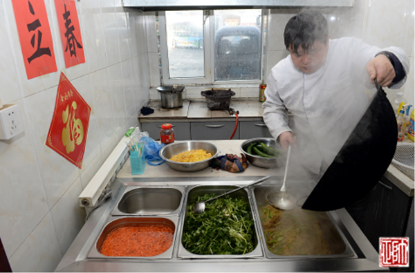 當(dāng)天,記者在211、222路大北門終點(diǎn)站看到,面積不足10平方米的食堂里,瓶瓶罐罐各種調(diào)料應(yīng)有盡有,兩名身穿制服的女調(diào)度員正在烙餅,她們身后的“大廚”正將豆芽、粉條、肉絲、蘿卜絲等食材依次放入炒鍋。終點(diǎn)站的“廚房”條件雖然簡(jiǎn)易,但大家一起干活兒的熱情絲毫不差。很快,一張張冒著熱氣的春餅就正式出鍋,炒好的卷餅菜也被盛放在保溫鍋里。