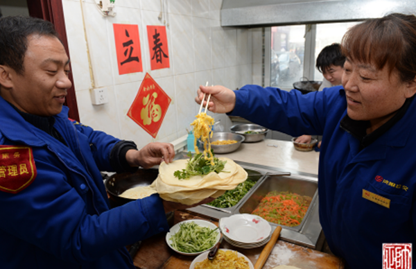 “哎呦,今天烙春餅啦!難怪老遠(yuǎn)兒就聞見(jiàn)了香味兒。快,給我先來(lái)兩張!”2月3日大年初七,是節(jié)后的第一個(gè)工作日,恰逢立春。11時(shí)左右,211路駕駛員張智剛跑完一圈兒回到大北門終點(diǎn)站,就被食堂的飯香吸引過(guò)去。